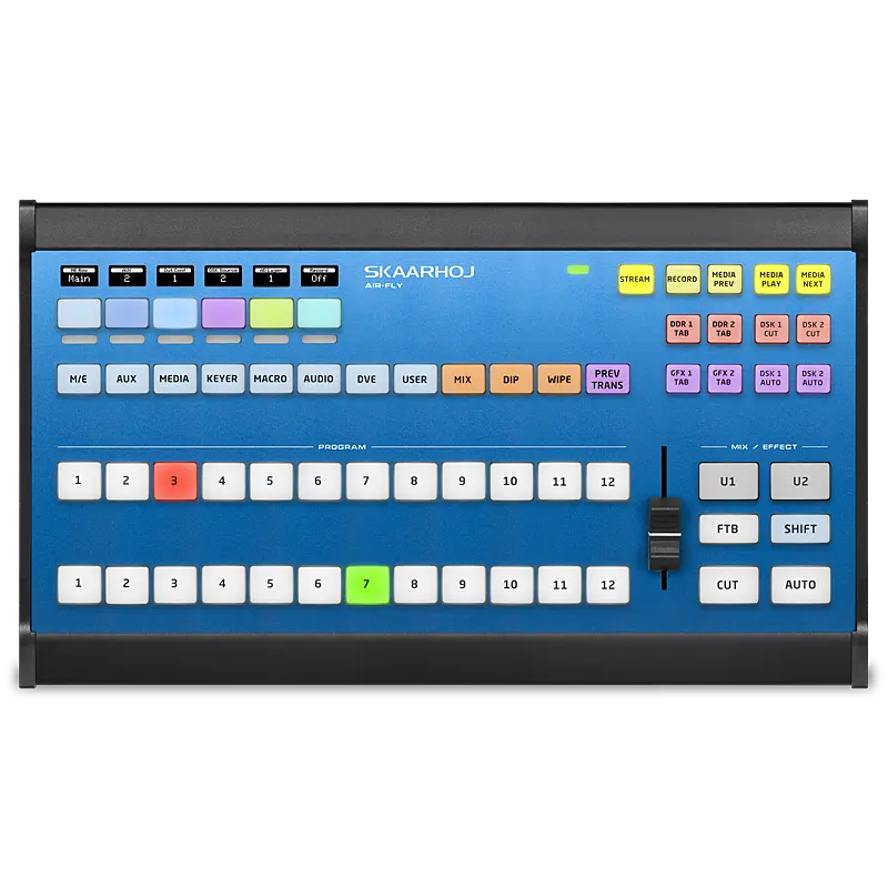Perfect choice where cost matters but SKAARHOJ quality needs to be preserved. Dedicated Program/Preview, clearly labeled menus and ancillary buttons. Durable fader to keep transitions state-of-art. Air Fly is available with 3 different label layouts – for ATEM, for vMix and for TriCaster; using system-specific naming for each.