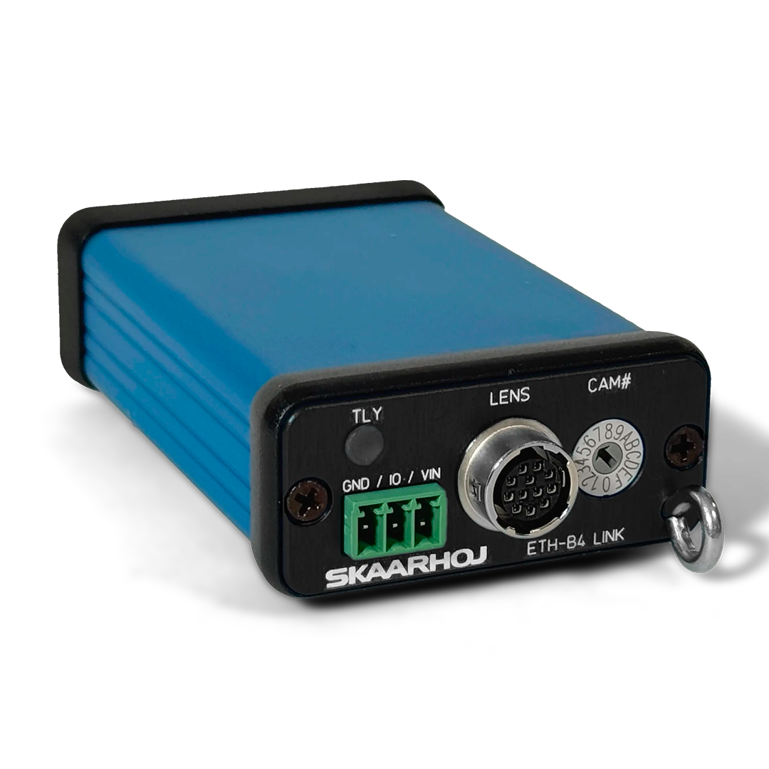 The ETH-B4 Link facilitates network connection for analog B4 broadcast lenses with a Hirose-12 connector, providing lens control via Ethernet. Utilizing SKAARHOJ's device cores, operators can precisely manage the iris of B4 lenses and access a dedicated tally channel. This device stands out with its incredibly light and compact form, offering a unique solution where iris control data is transmitted separately from camera control signals. Features include a camera selector switch for ID and IP configuration, analog output via Hirose-12 connector, and a dual-color tally lamp, along with a relay output for program tally signals, ensuring a comprehensive control experience.